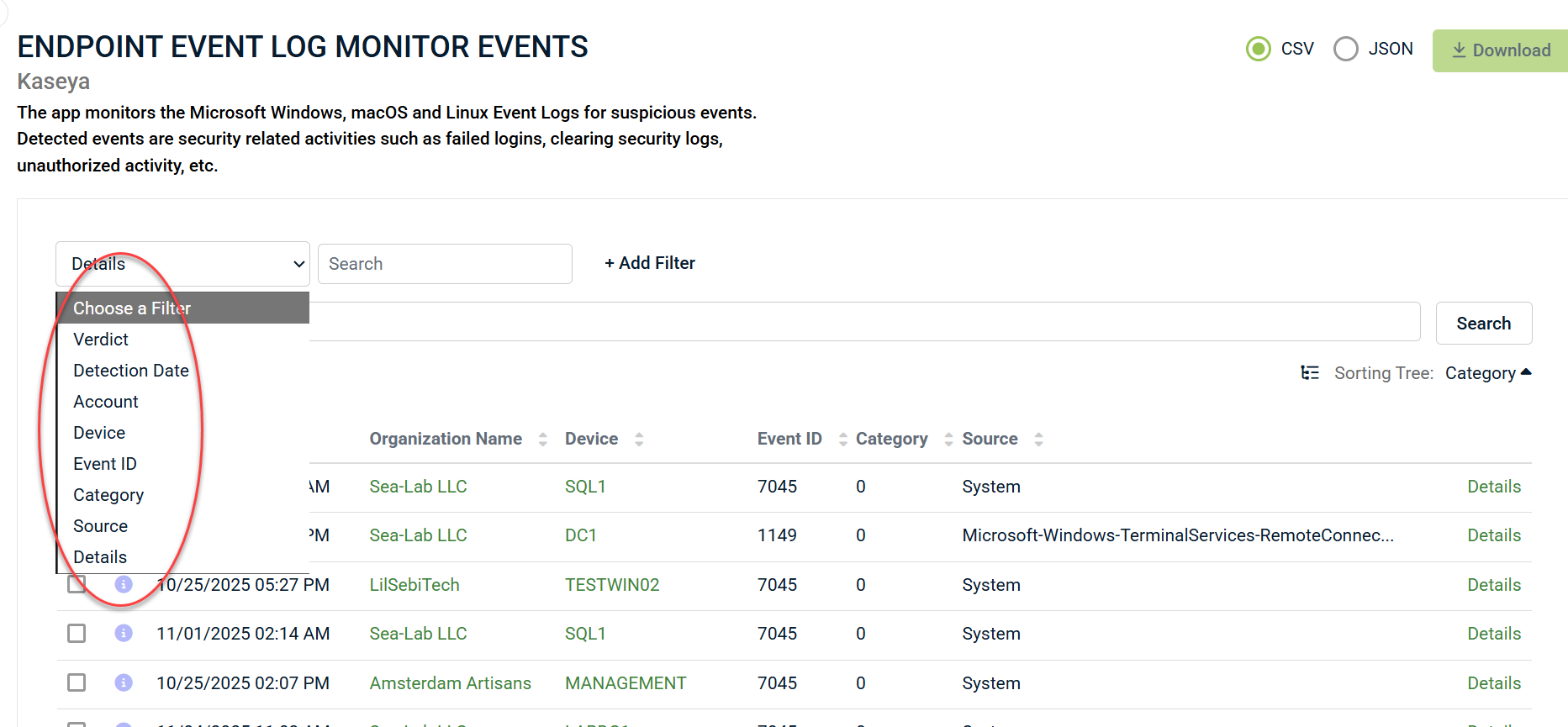 The process for searching and filtering data has been significantly improved with the Search/Filter interface. This interface provides quick ways to filter data based on the app being reviewed. For example, in the Endpoint Event Log Monitor App, the available default search fields are the following: