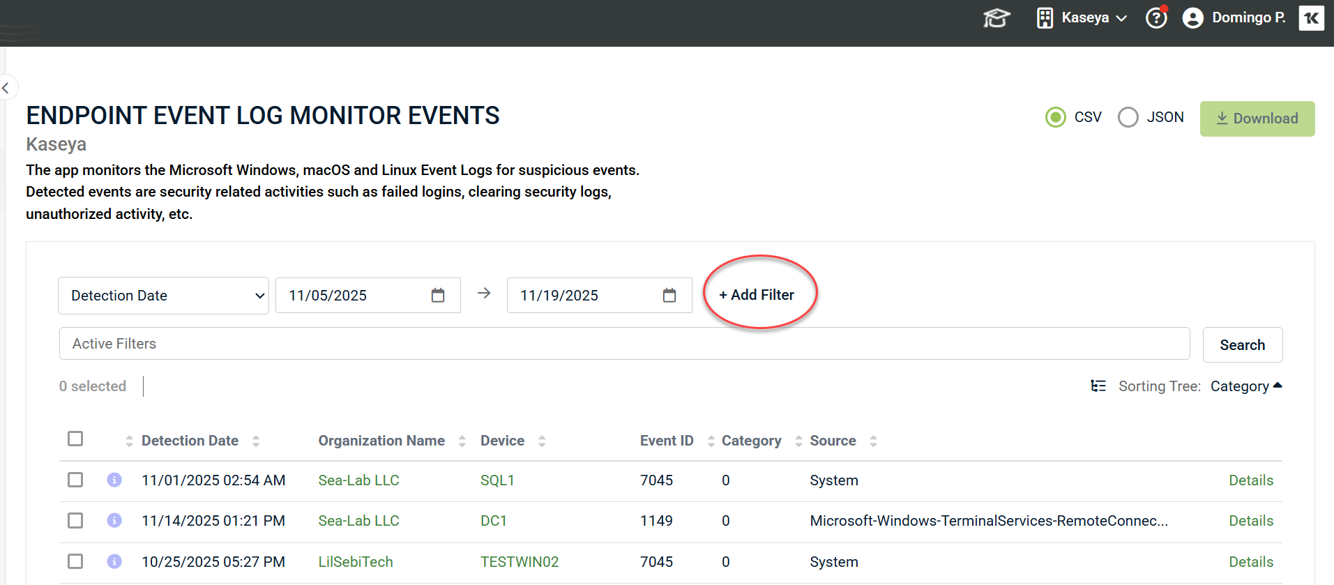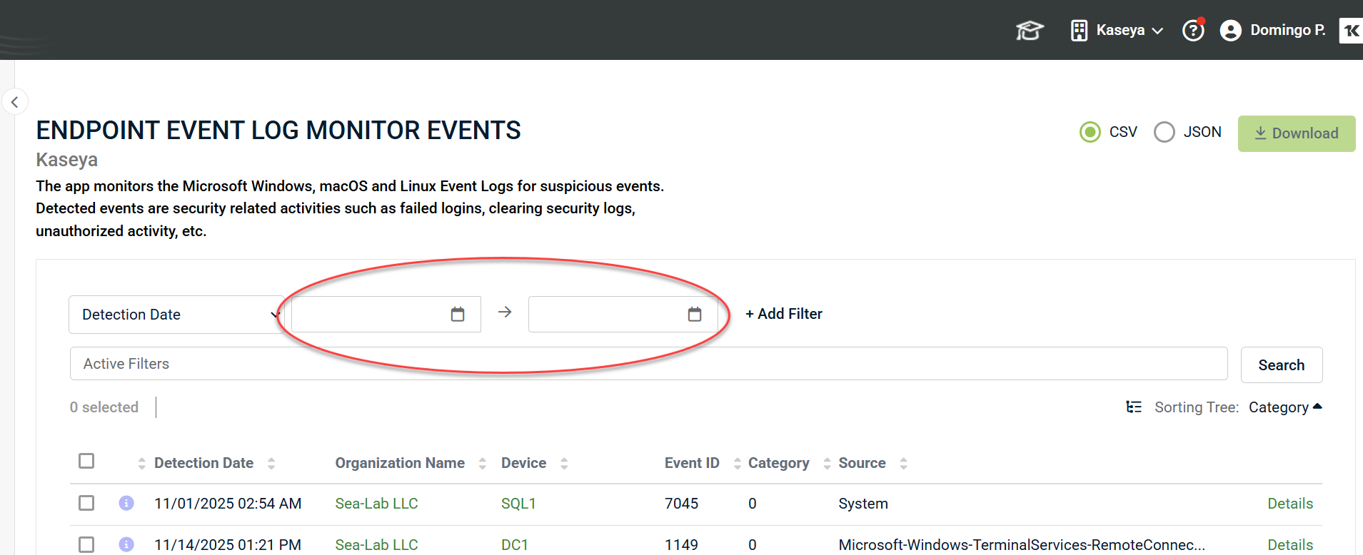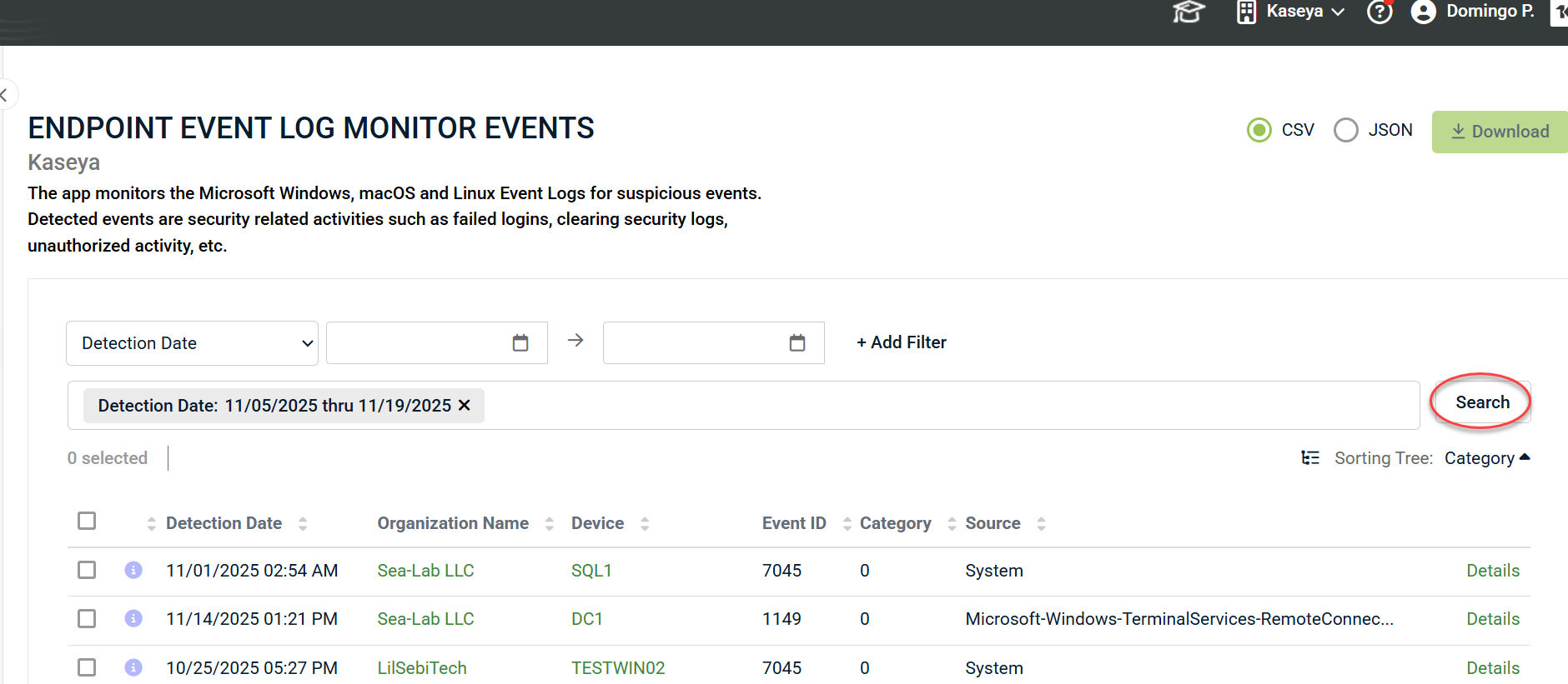 In the previous example, results will only be displayed if the Detection Date is between 11/05/2025 AND 11/19/2025 AND the event id is 4624.