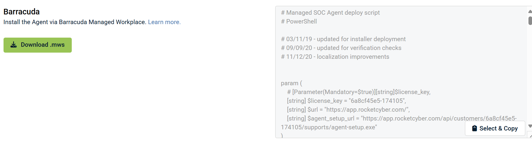 - The console generates an agent deployment script (.mws) file that can be imported directly into Managed Workplace. You can use the same .mws file across organizations. It requires that the appropriate license key parameter is filled in when scheduling the script to run.