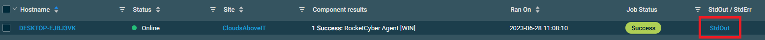 - Validate agent installation was successful by navigating to the Completed tab in the Jobs section. Select the Job and view the StdOut or StdErr result.