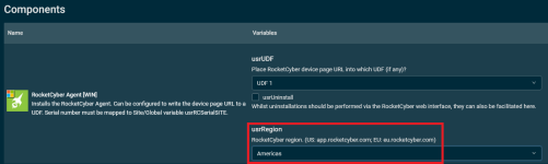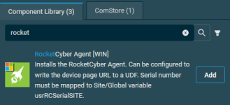 - Search for RocketCyber in the ComStore. Add the RocketCyber Agent [Win] component.