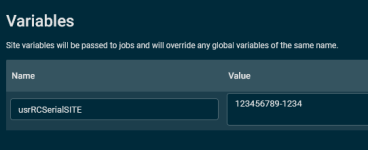 - Scroll down to the Variables section and set the Name field to usrRCSerialSITE. Then paste the license key copied in Step 2 in the Value field.