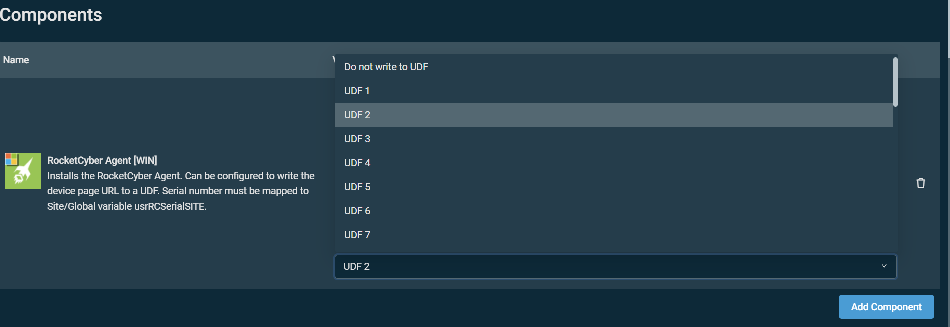 6. In the Components section, if you would like to populate a user-defined field (UDF) for RocketCyber, select any unpopulated UDF from the list. Refer to User-defined fields. When viewing a Datto RMM device mapped to RocketCyber, the RocketCyber UDF will be configured as a link to the corresponding RocketCyber device page, allowing you to open RocketCyber device details directly from Datto RMM.