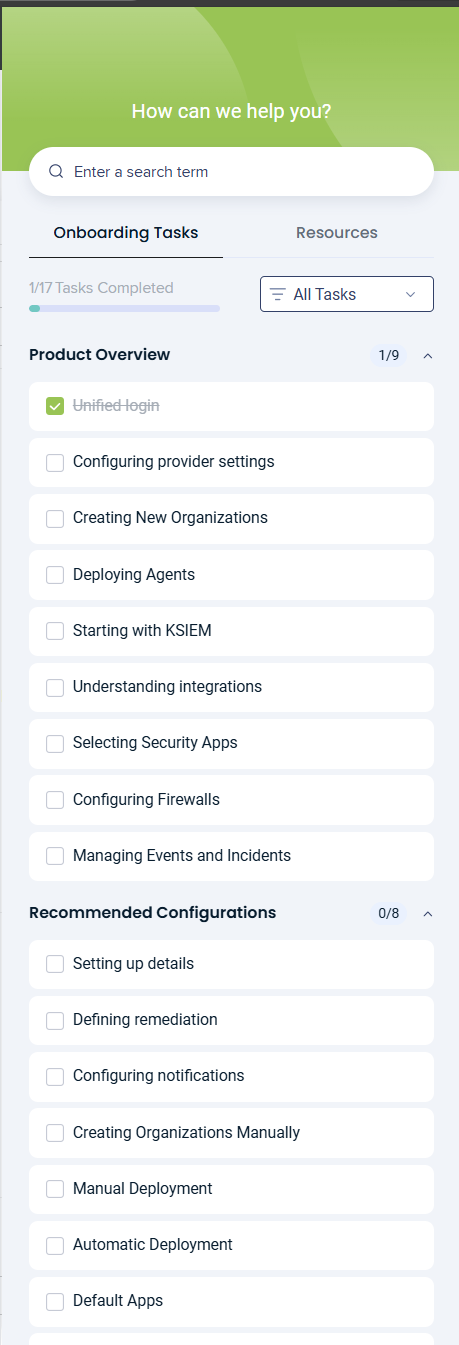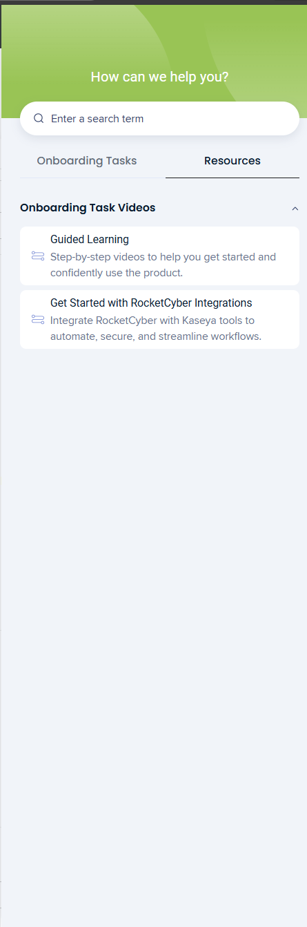 If you still need to complete your self-guided onboarding for RocketCyber, in the event that you closed it while configuring other setups, you can proceed by accessing it directly clicking the Tasks tab in the graduation cap icon of your RocketCyber instance or by following the steps outlined below: