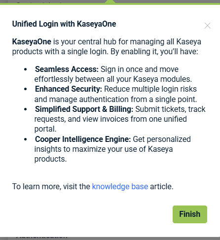 Unified Login (also known as Log in with KaseyaOne) allows you to access all subscribed IT Complete modules using a single set of credentials. When Unified Login is enabled, you can sign in to RocketCyber directly from KaseyaOne without managing separate usernames and passwords.