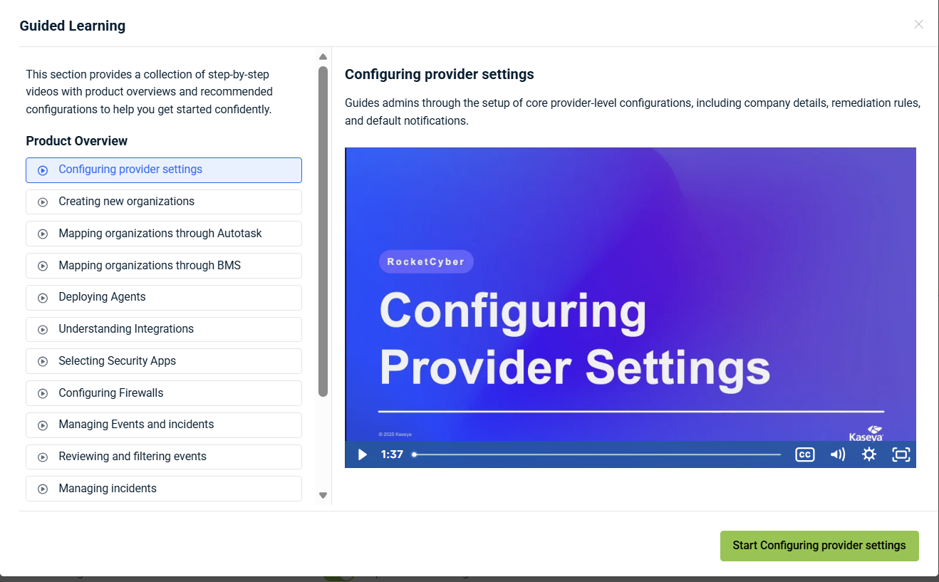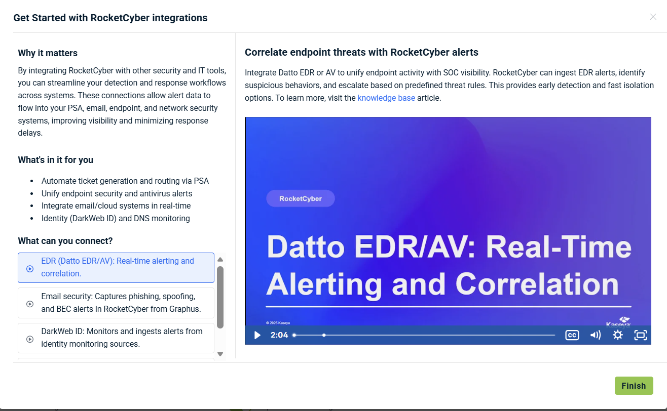 Getting Started with Integrations: Videos that explain how to integrate RocketCyber with Kaseya tools to automate, secure, and streamline workflows.