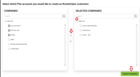 - Select which company names will populate into RocketCyber then ">" to move to Selected Companies list then Select All and Create Companies