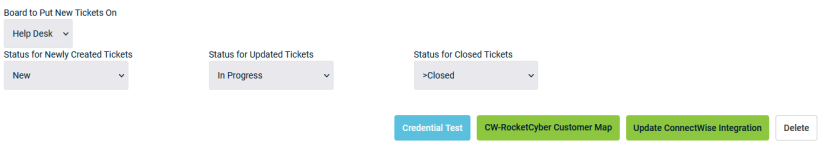 - Select a board from the dropdown and click Update ConnectWise Integration. New security tickets from RocketCyber will appear on the selected board.