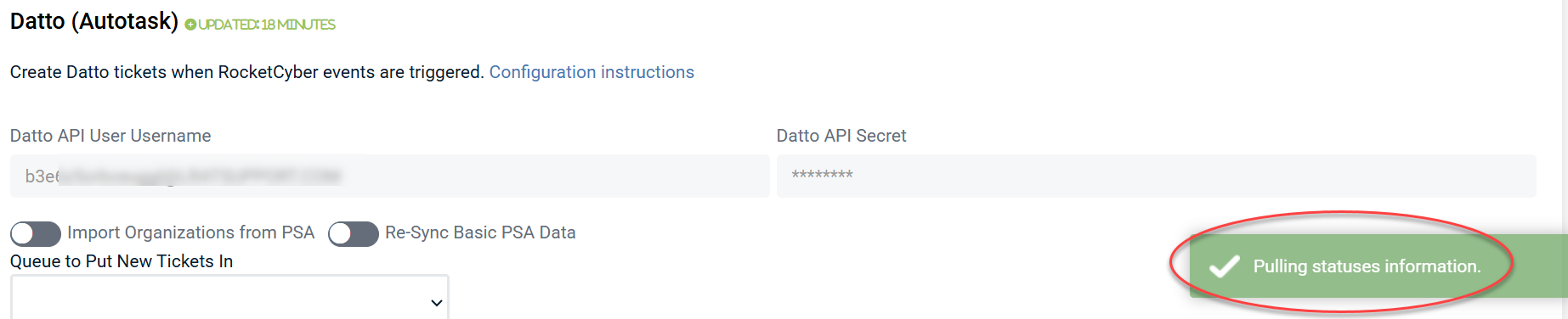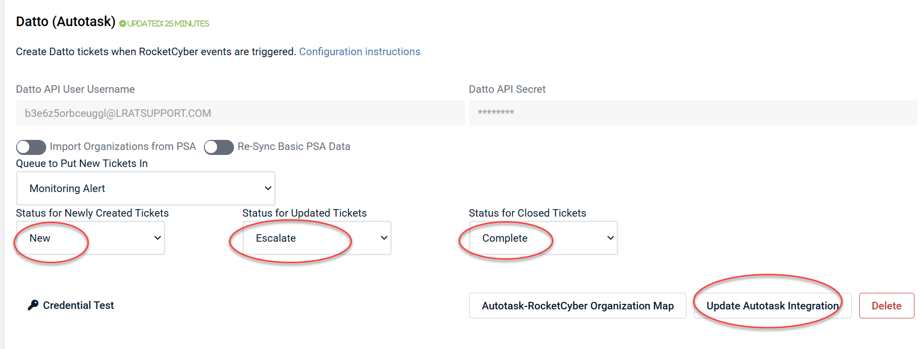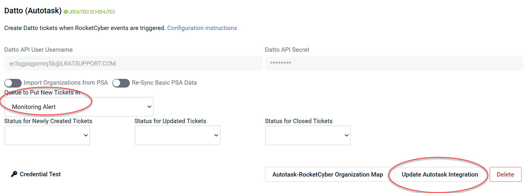 7. Select a queue from the Queue to Put New Tickets In drop-down menu and click Update Autotask Integration. New security tickets from RocketCyber will appear in the selected queue.