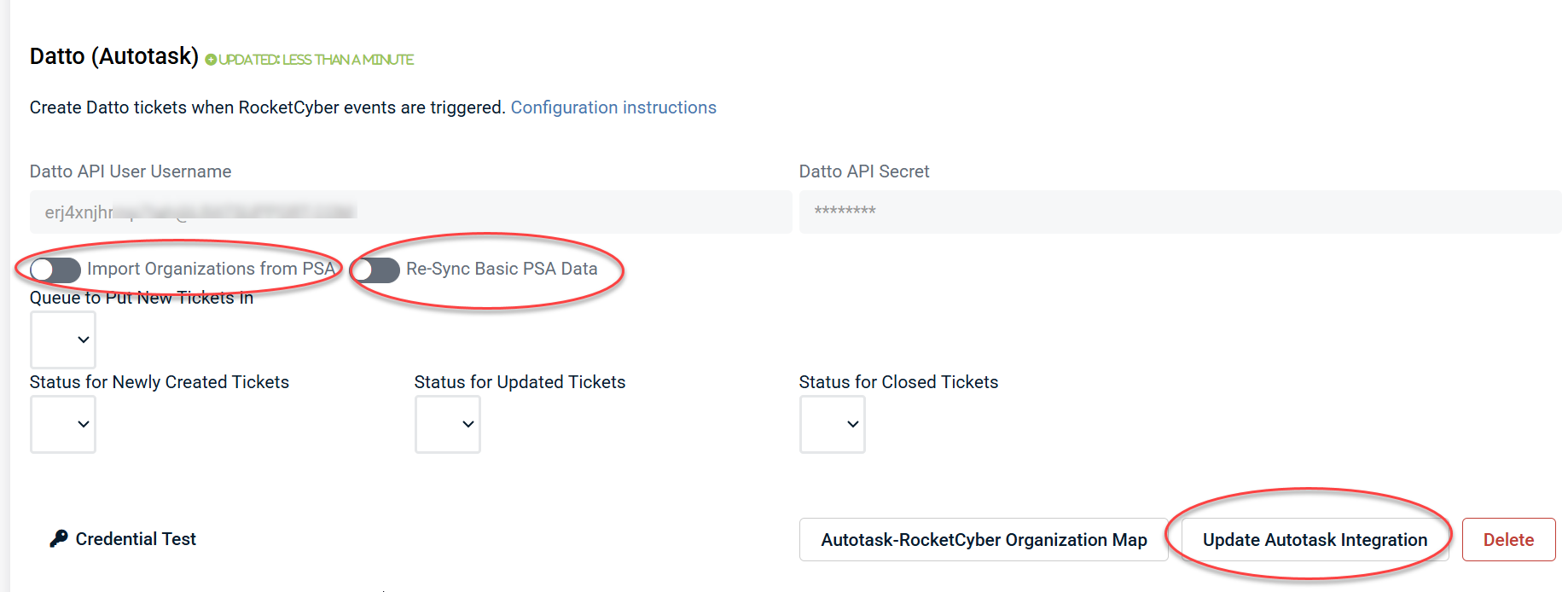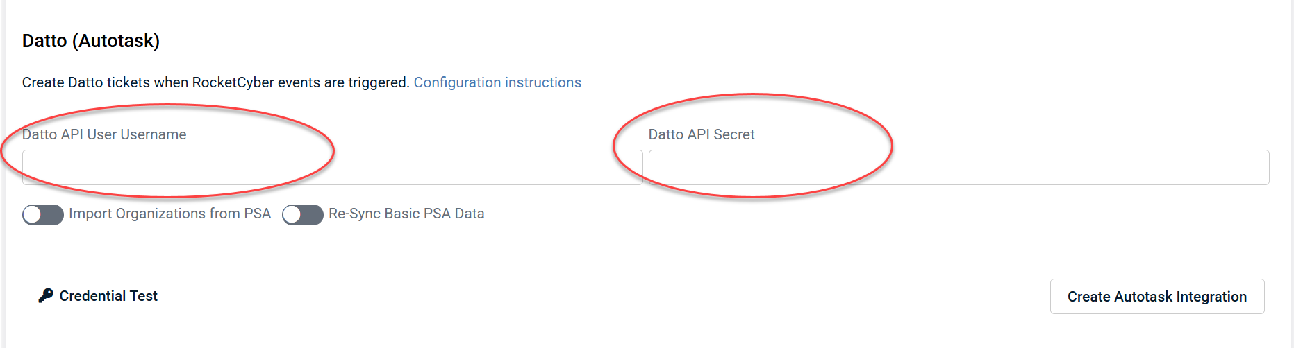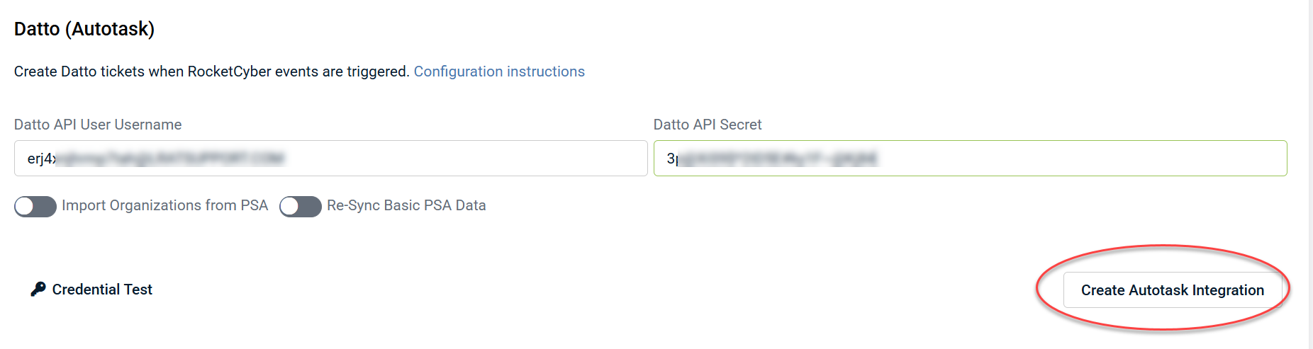 3. In the PSA tab under the Datto (Autotask) section, enter the username (key) and secret that you saved in step 1.