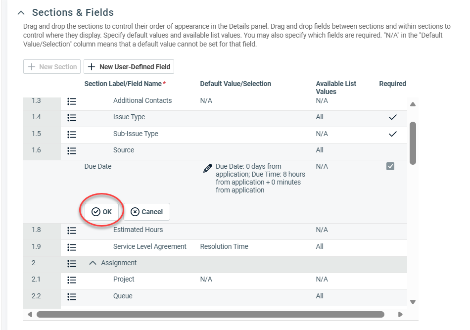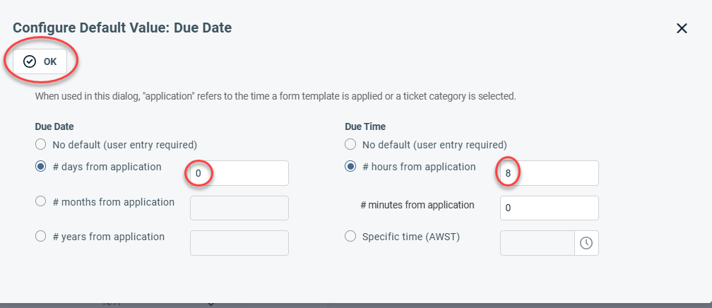 - In the Configure Default Value: Due Date dialog, set the expected Due Date and Due Time. In this example, we set the default Due Date to 0 days from ticket creation and the Due Time within 8 hours of ticket creation. Please adjust these values as needed for your organization. It is essential to set must set default values for both Due Date and Due Time. When you finish modifying the values, click OK.
