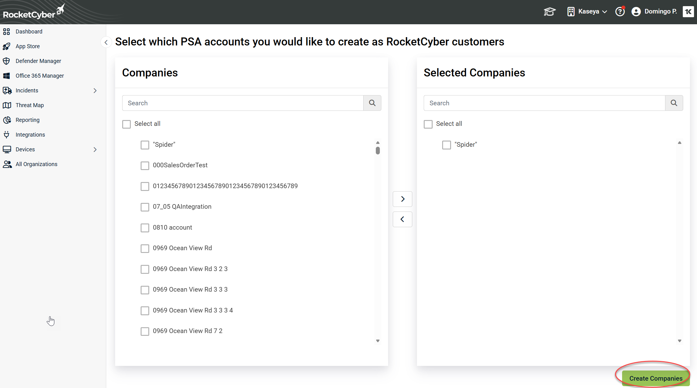 12. This will import a list of companies to choose which organizations to pull into RocketCyber. Check which organizations to add then ">" to add to Selected Companies list, select all then click Create Companies. It is not necessary to select companies that were added manually into RocketCyber, this will create a duplicate.