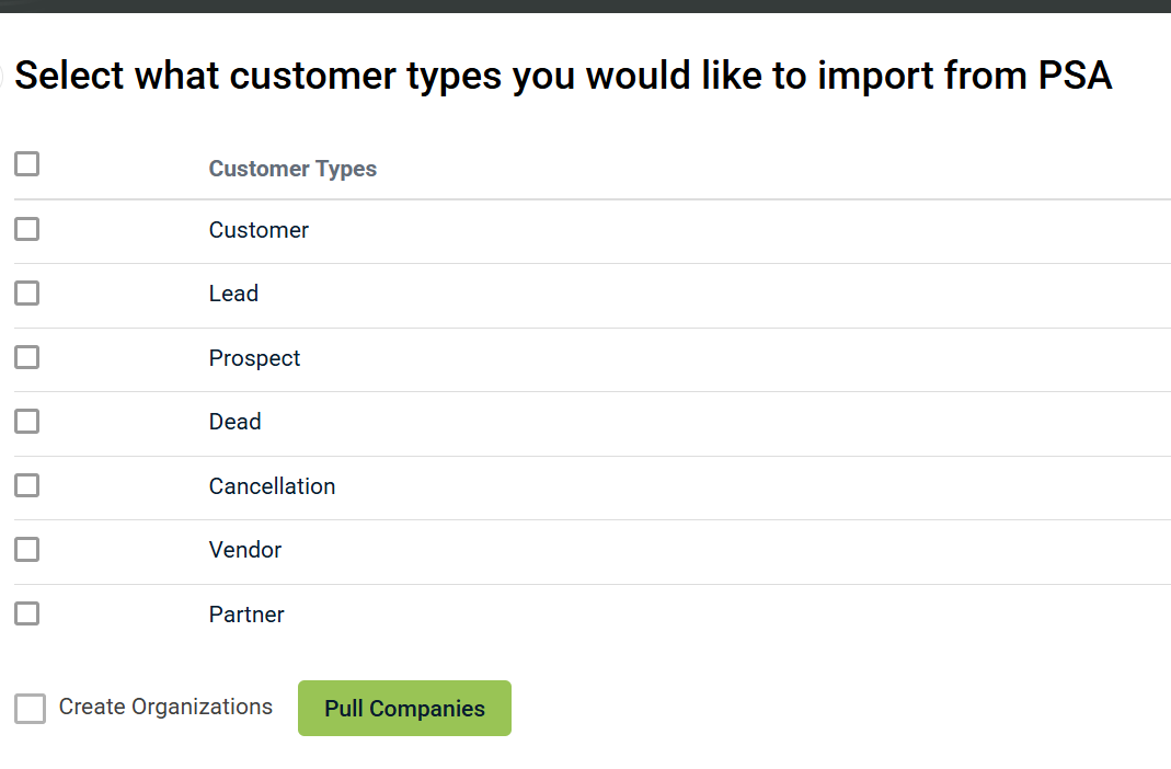 NOTE To import additional organization types for an existing integration, turn on both Import Organizations from PSA and Re-Sync Basic PSA Data, and then click Update Integration.