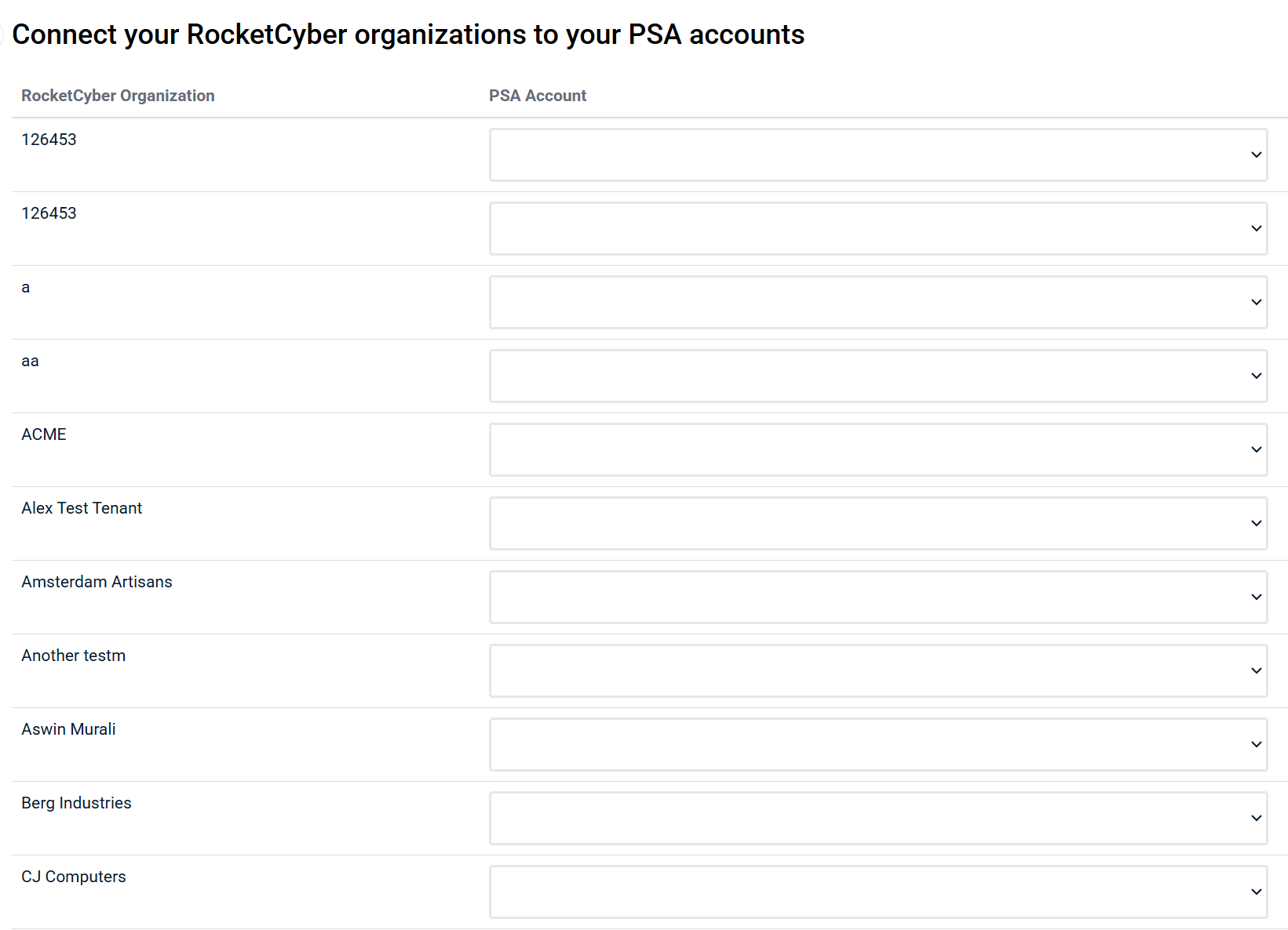 13. Once completed, click Autotask-RocketCyber Organization Map to see the list of organizations, for organizations entered manually in RocketCyber the mapping will be blank and will need to be selected in the PSA Account drop-down menu.