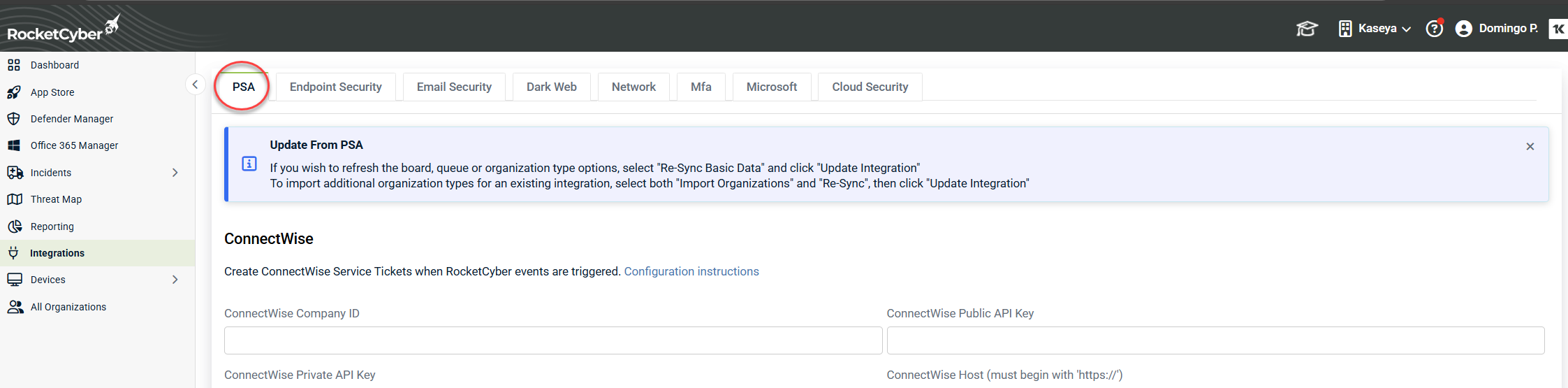 - If you refresh the page or again select Kaseya-RocketCyber Organization Map, you will now see a list of available RocketCyber organizations, each with a dropdown. Select the appropriate PSA company for each and click Save Integration Settings.
