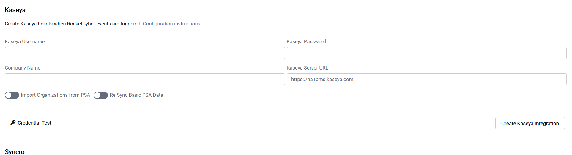- Kaseya cannot create a service ticket unless it is associated with a specific company. Select the Kaseya-RocketCyber Organization Map button