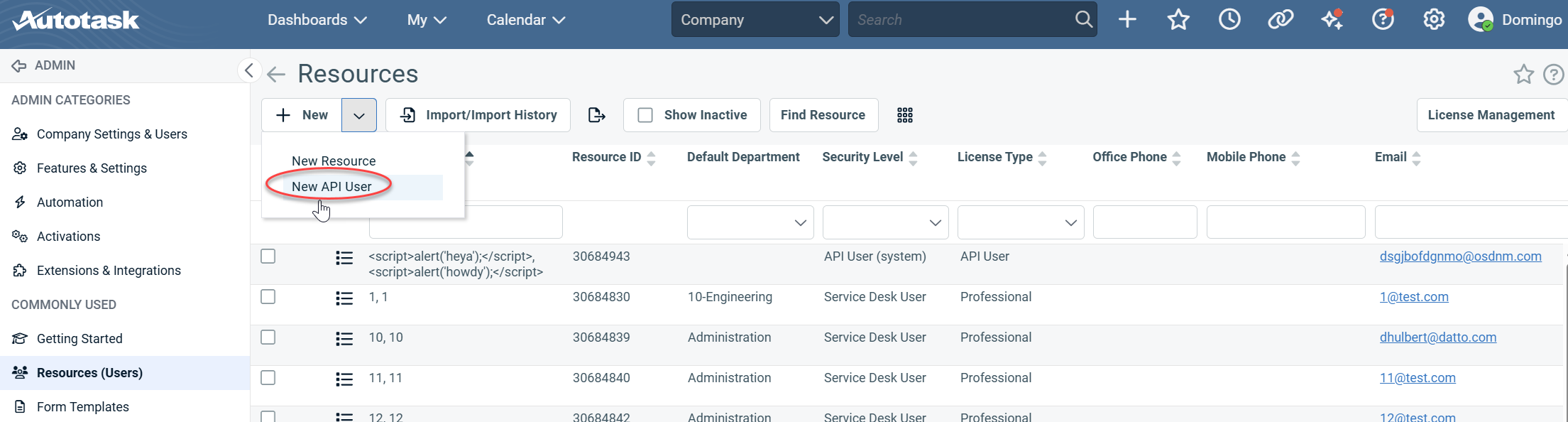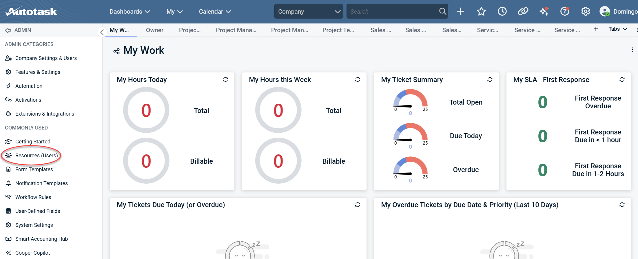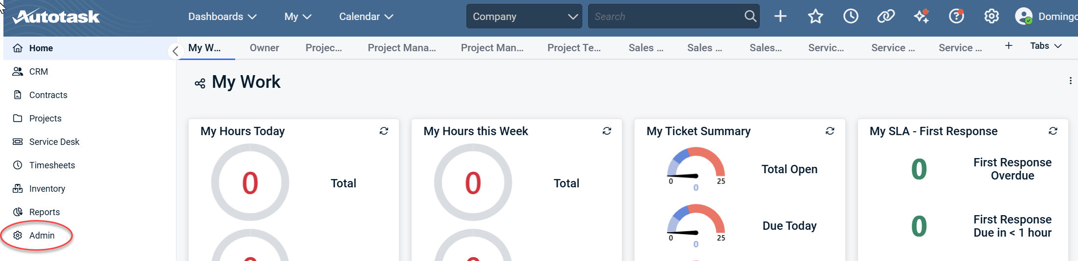 - From the Autotask dashboard, navigate to the Admin section in the left menu.