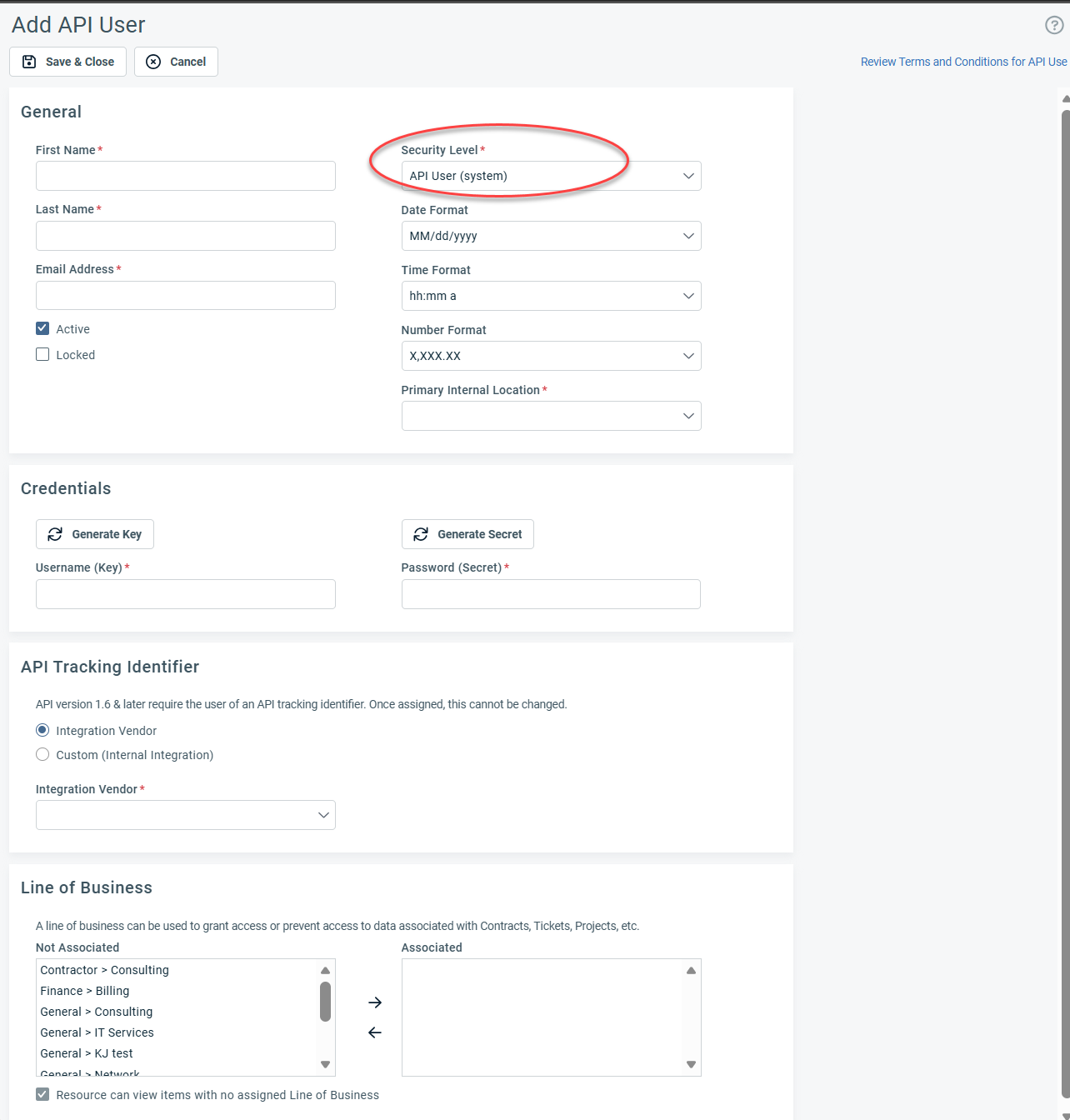 - Fill out the required information for the new API user, ensuring that the Security Level is set to API User.
