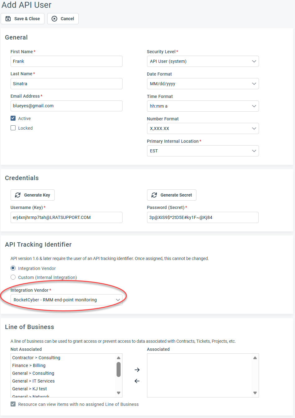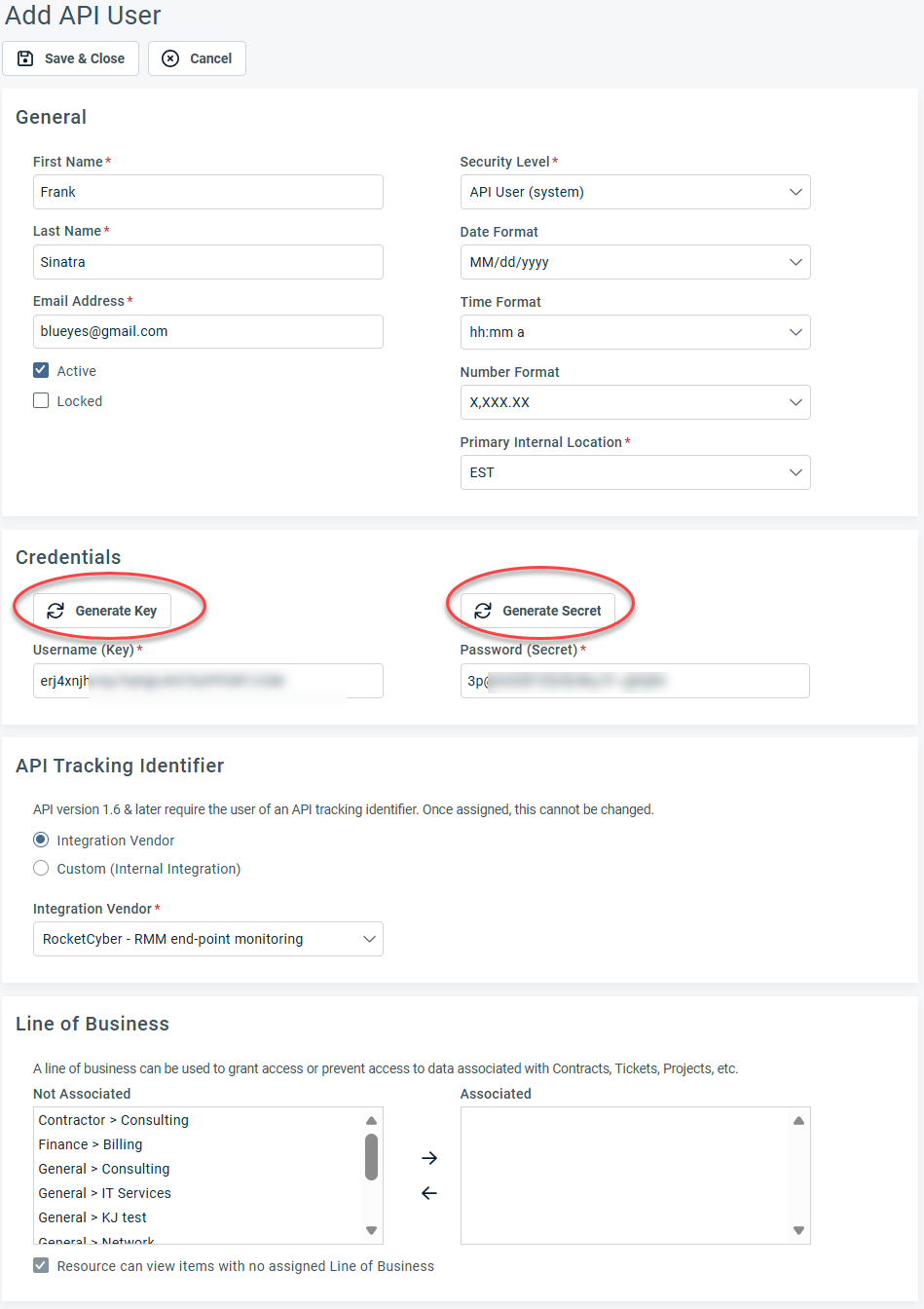 IMPORTANT Be sure to copy both the key and secret, as these will be needed for integrating Autotask with RocketCyber.