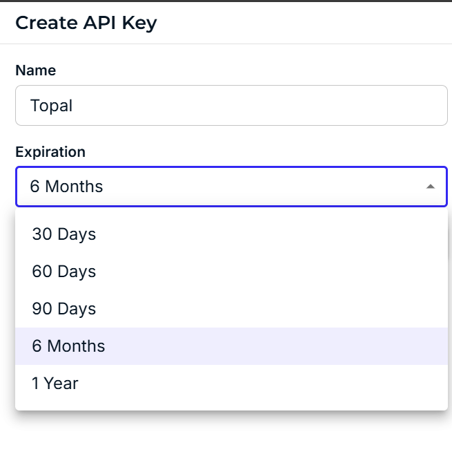 5. Enter a name for your key. Note that this name cannot be changed once the key is created. Choose an expiration date from the drop-down menu.