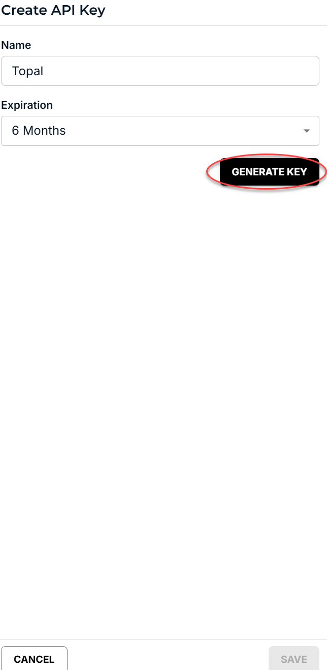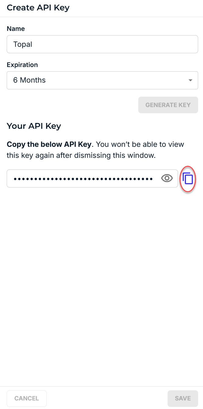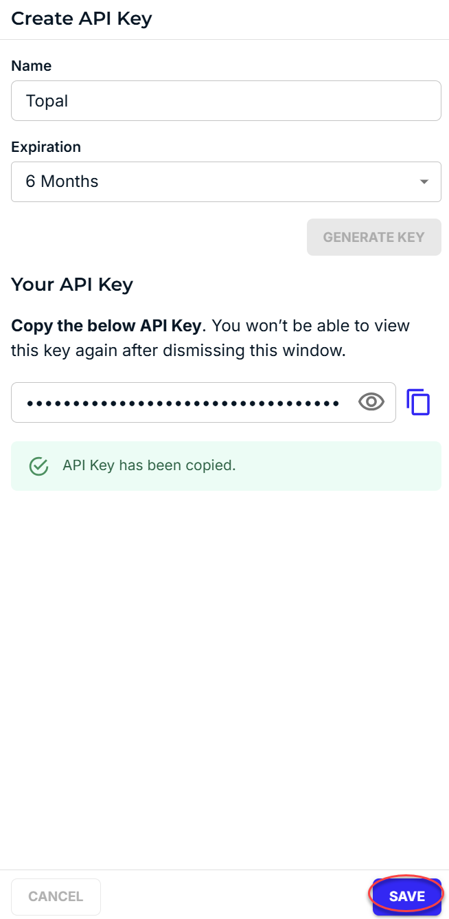 7. Copy the API key. This is the only time the key will be displayed, and the Save option will be inactive until the key is copied.