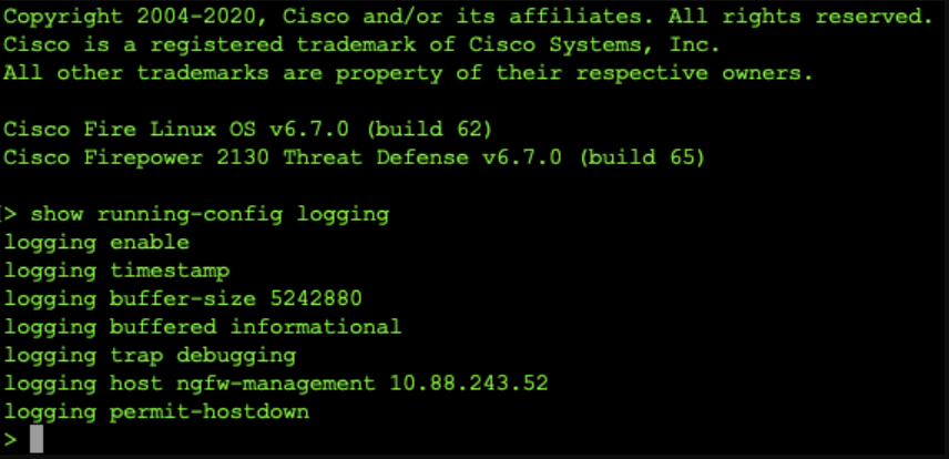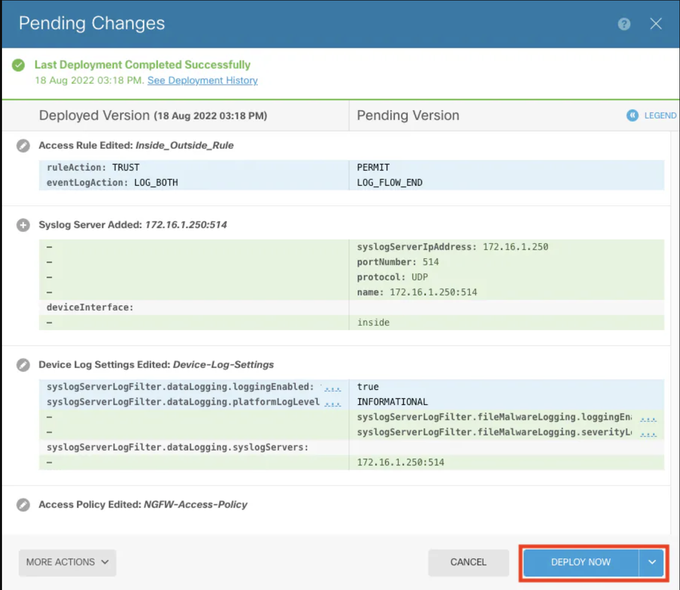 1. Check configuration in CLI: After the deployment task completes, verify the settings in the FTD CLI (Clish Mode) by using the command: `show running-config logging`.