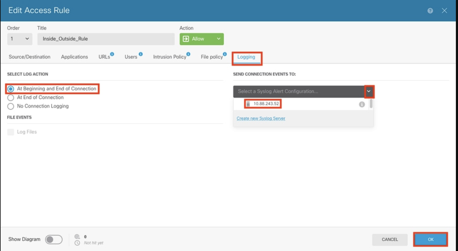 3. Configure logging: On the Logging tab, select At Beginning and End of Connection. Under Select a Syslog Alert Configuration, choose the Syslog server and click OK.