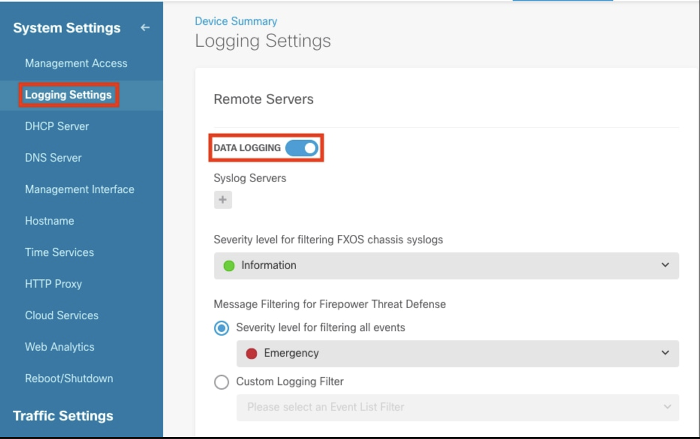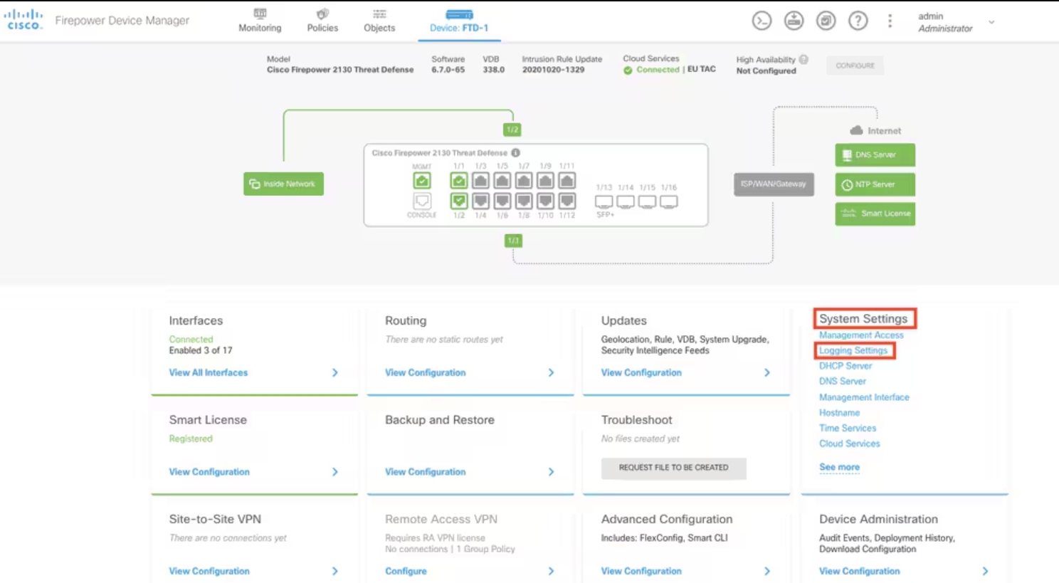 1. Access logging settings: From the main Firepower Device Manager screen, select Logging Settings under System Settings in the lower-right corner of the screen.
