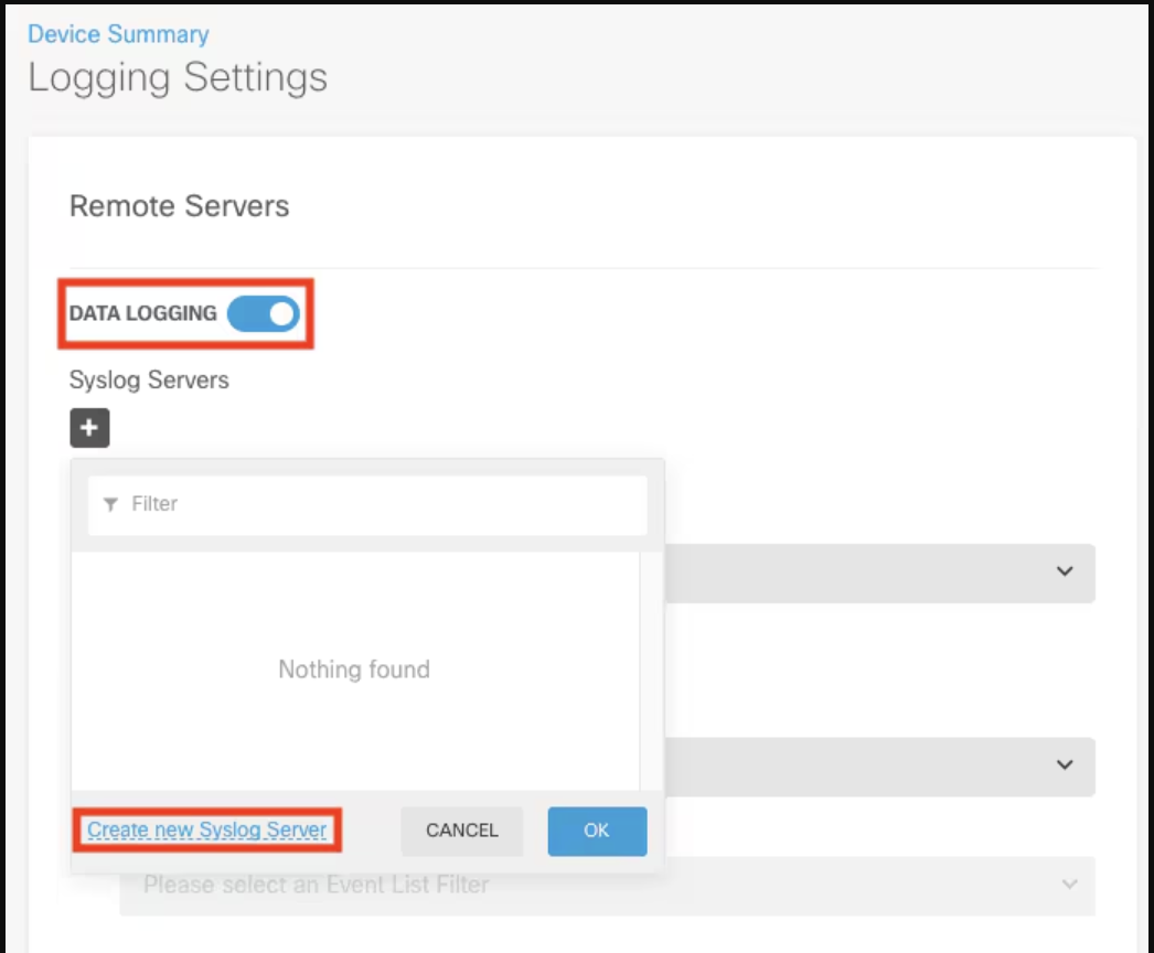 3. Enable data logging: Turn on the Data Logging toggle switch and click the + sign under Syslog Servers.