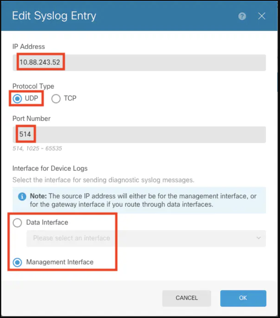 5. Enter server information: Input the IP address of your Syslog server and port number. Select Data Interface and click OK.