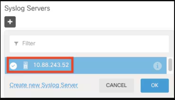 6. Finalize Syslog server addition: Select the newly added Syslog server and click OK.