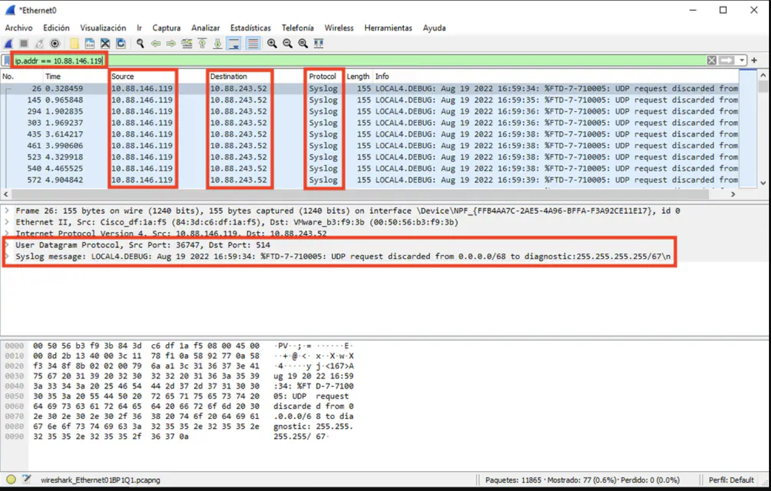 2. Create packet capture: Set up a packet capture for UDP port 514 (or TCP port 1468 if you are using TCP).