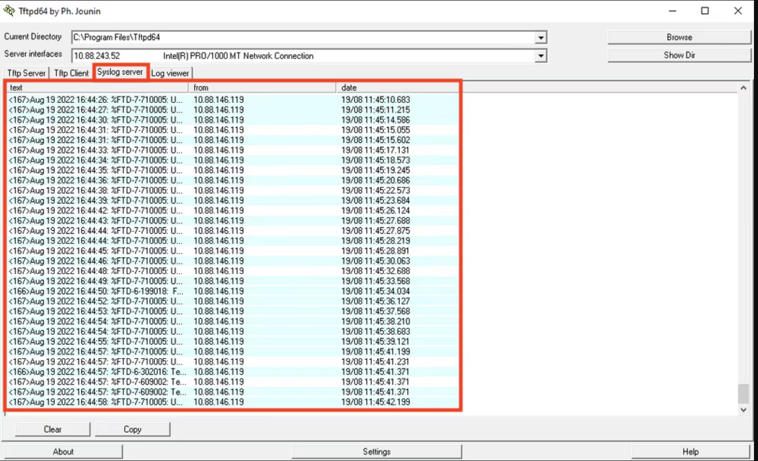 2. Verify Syslog server: Navigate to the Syslog server tab and check if the Syslog server application accepts the Syslog messages.
