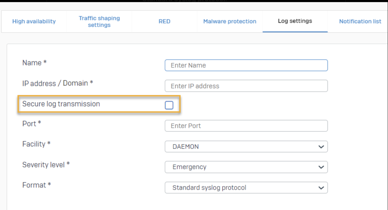 Secure log transmission: Select this checkbox to encrypt logs sent to the Syslog server using TLS.