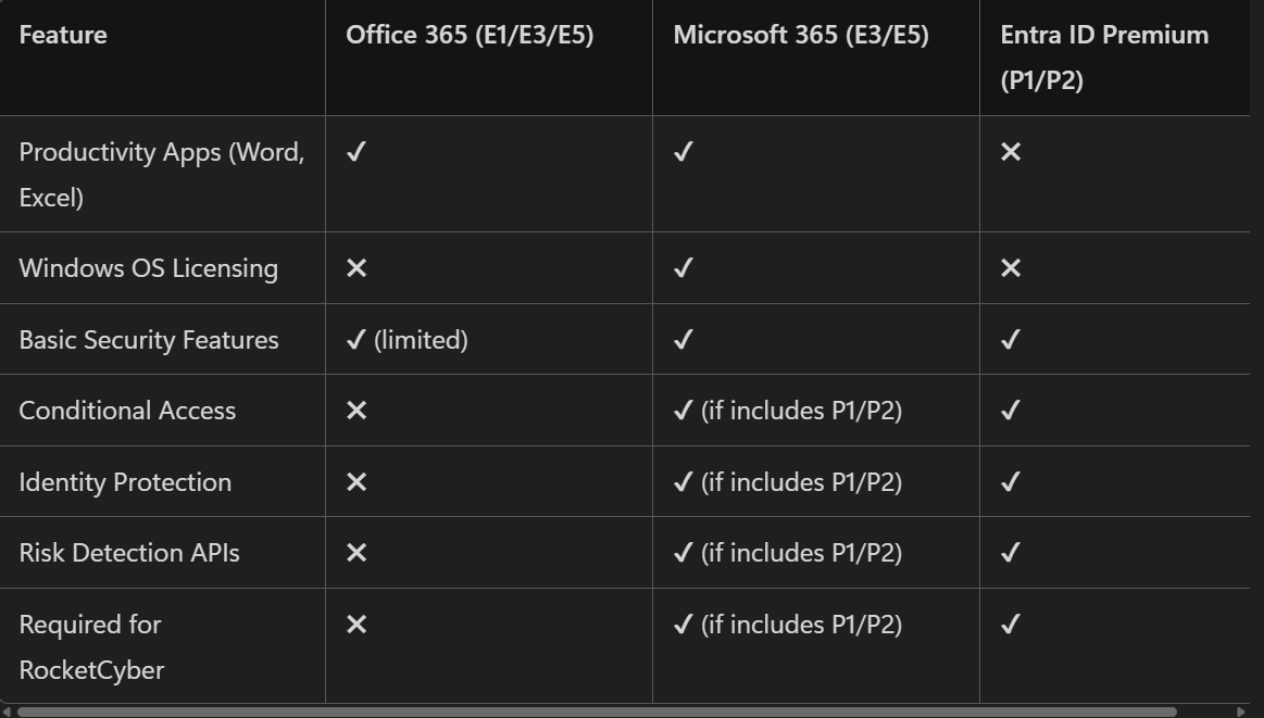 It's crucial to understand that an Office 365 license alone does NOT include advanced identity security features like Conditional Access, Identity Protection, or Risk Detection APIs. Microsoft 365 plans typically include Entra ID Premium P1 or P2, which are required for RocketCyber integration.