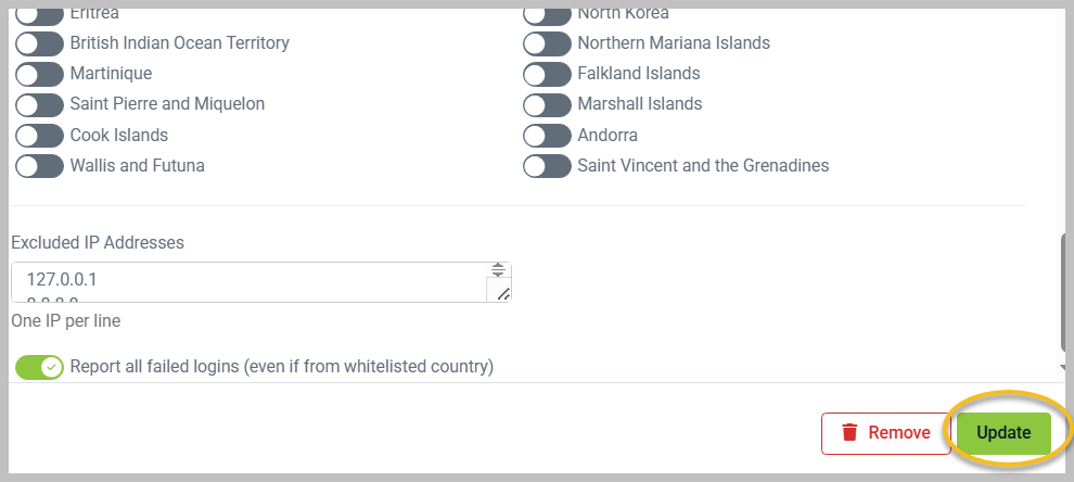 You can turn on a toggle to report all failed logins, even from an allowlisted country.