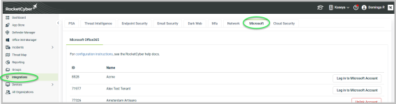 Click Integrations on the left menu and navigate to the Microsoft tab.